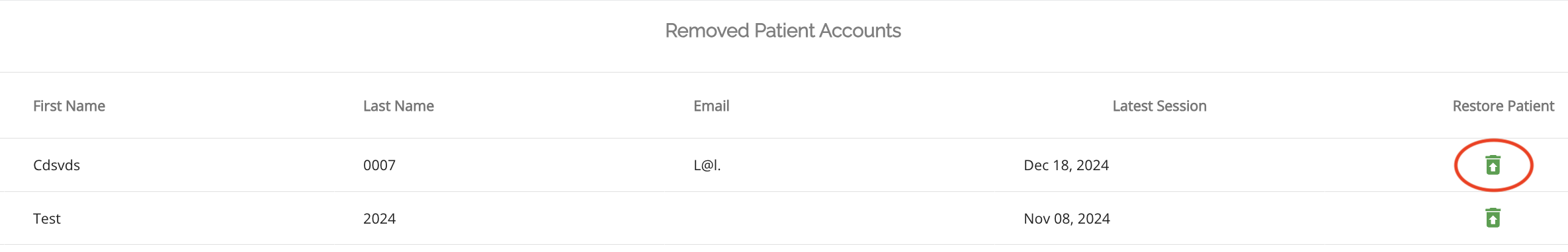 3. Scroll to the bottom of your patient list, where there is a list of “removed patient accounts”.