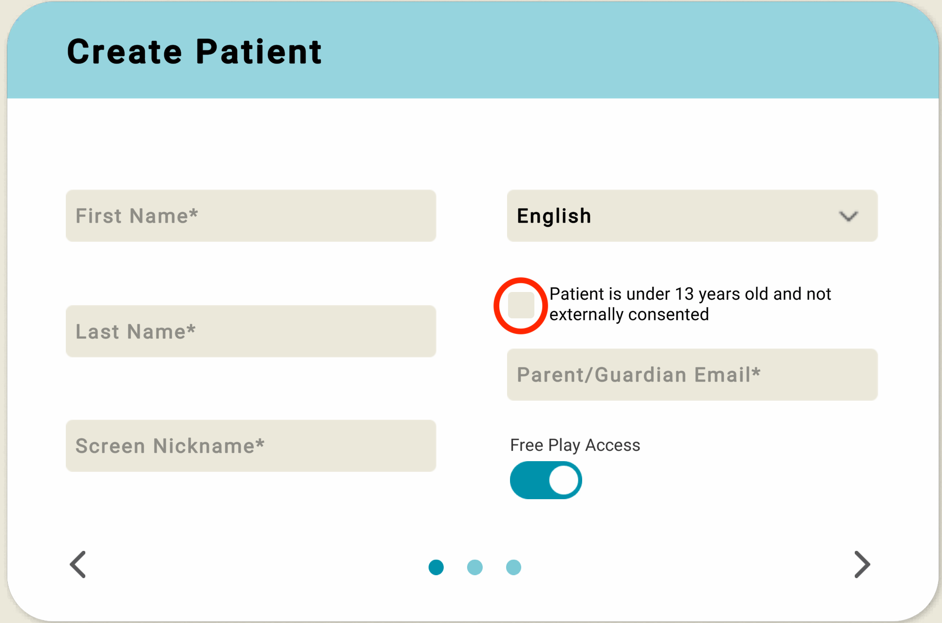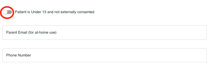 3. Create a new patient account and be sure to toggle off the button that says "Patient is Under 13 and not externally consented."